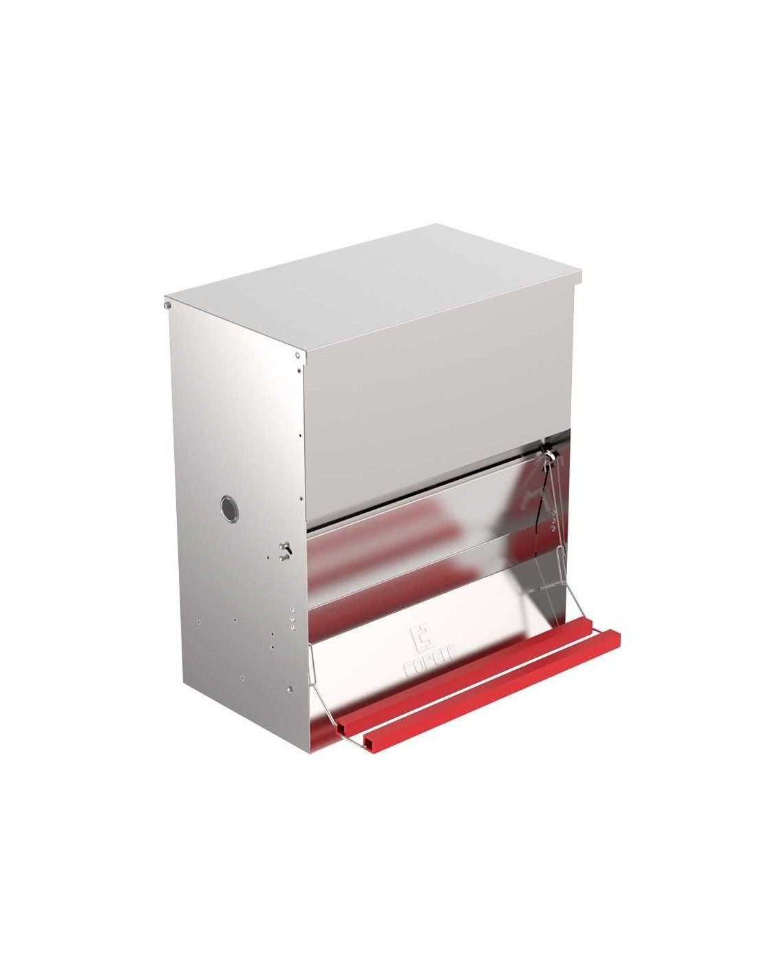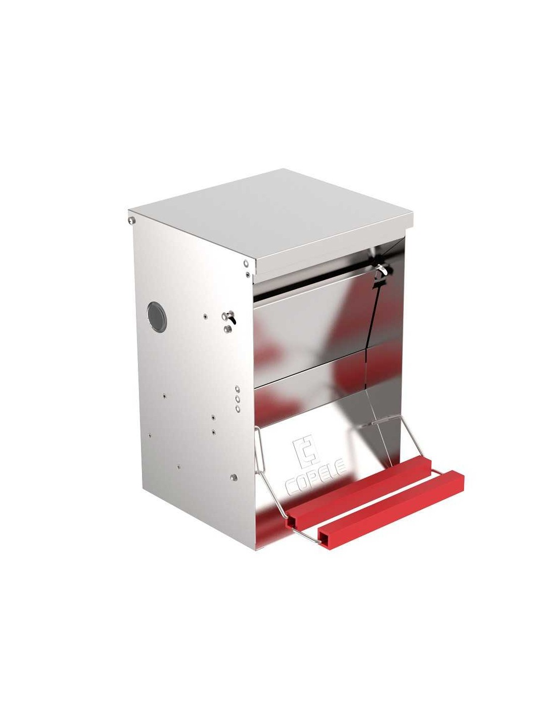 Fabricada con materiales duraderos como chapa galvanizada y varilla galvanizada, esta tolva cuenta con un pedal de accionamiento de PVC que permite a las aves acceder al alimento de manera fácil y sin ensuciar el mecanismo.