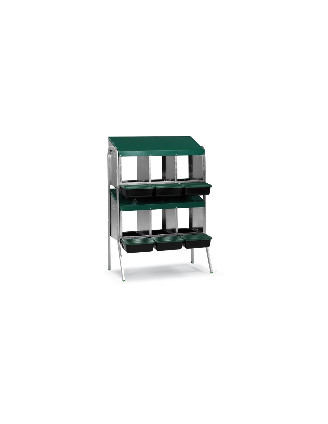 Fabricado con chapa galvanizada de alta calidad, este ponedero cuenta con seis departamentos independientes, cada uno equipado con su propia cubeta.