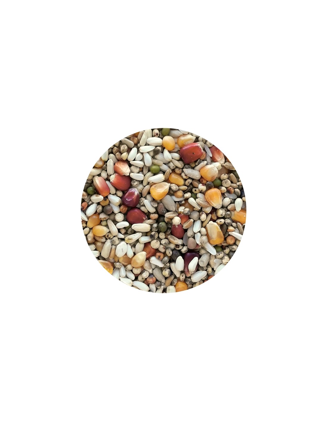 Esta mezcla contiene una combinación de granos como maíz, trigo, avena pelada, dárico, arveja, pipa, cañamo, arroz, soja verde, sorgo y linaza, que proporcionan una fuente rica en nutrientes esenciales.