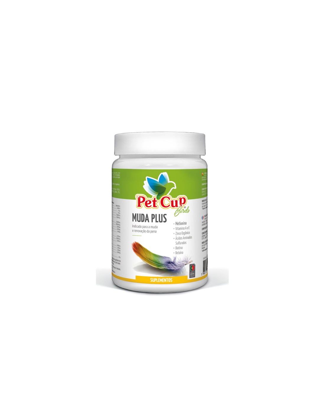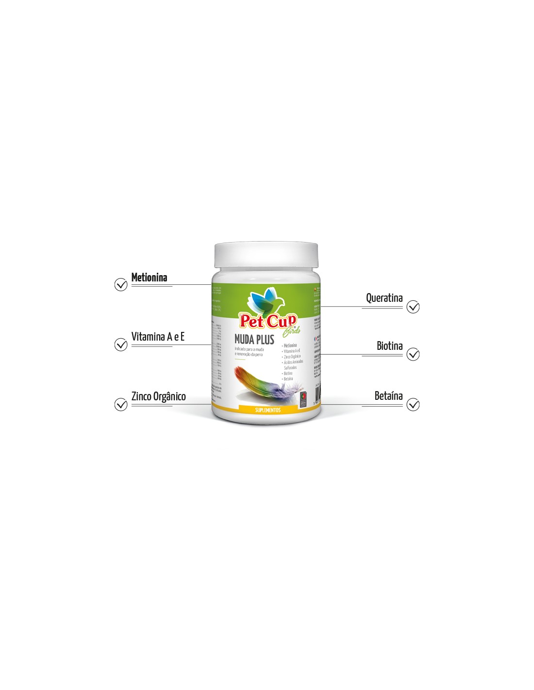 El PET CUP MUDA PLUS - 250 GR es un suplemento alimenticio diseñado para mejorar la calidad de las plumas de tus aves.