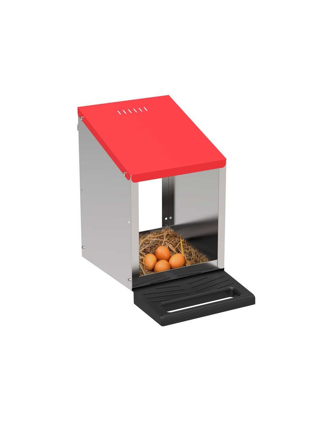 Fabricado con chapa galvanizada, este nido cuenta con un único departamento que permite extraer la bandeja desde el interior del gallinero.