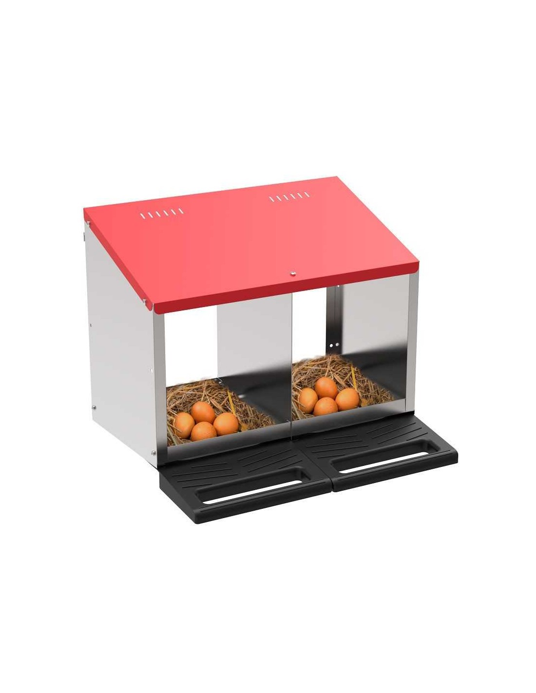 Fabricado con chapa galvanizada, este nido cuenta con dos departamentos independientes que permiten extraer la bandeja desde el interior del gallinero.