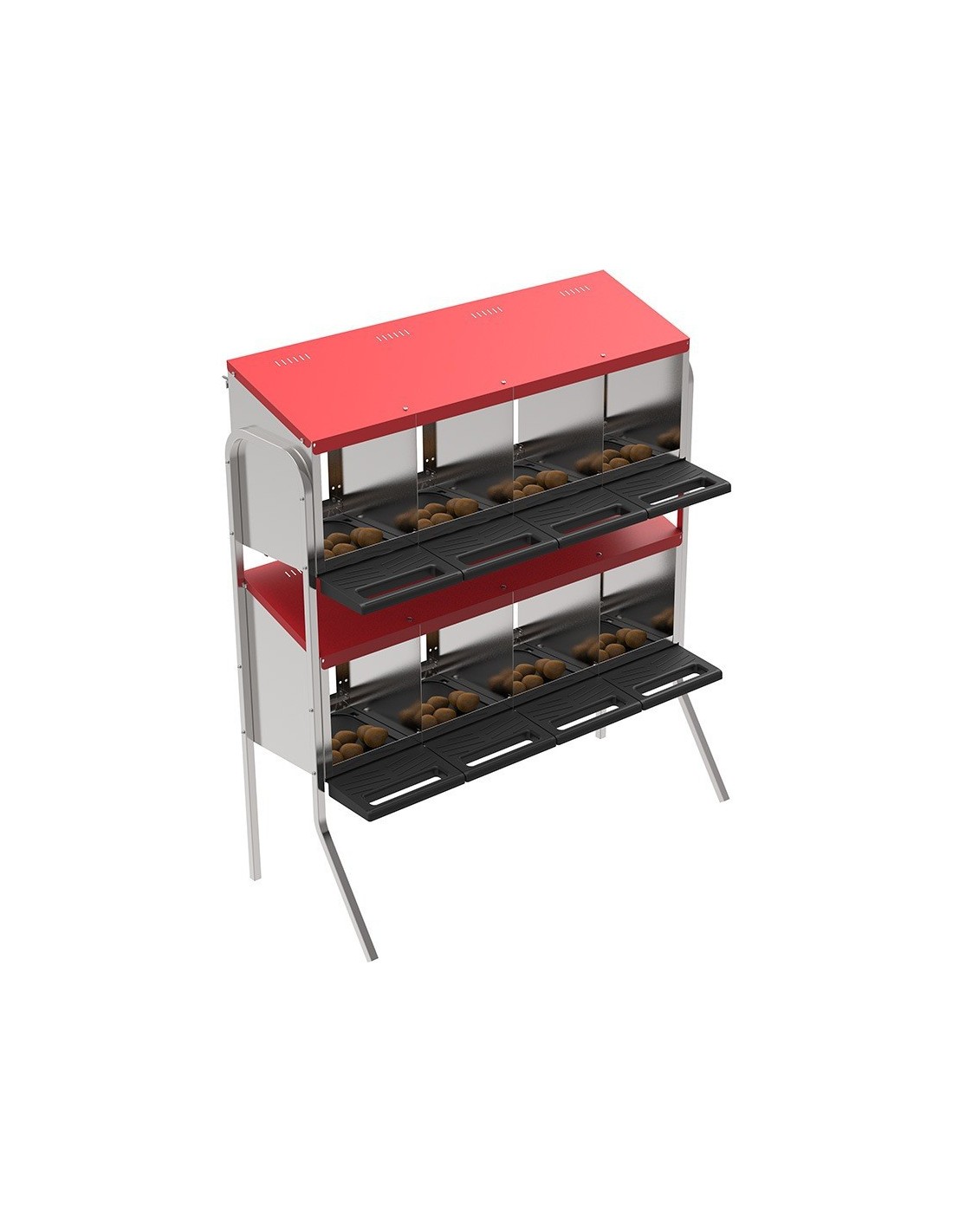 Este nido de dos niveles con ocho departamentos proporciona suficiente espacio para que tus gallinas aniden cómodamente.