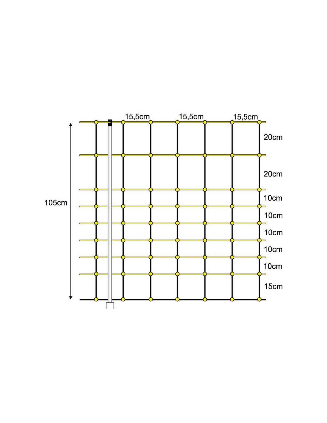 Con una altura de 90 cm y una longitud de 50 metros, esta malla está equipada con 14 varillas y accesorios de conexión que facilitan su montaje.