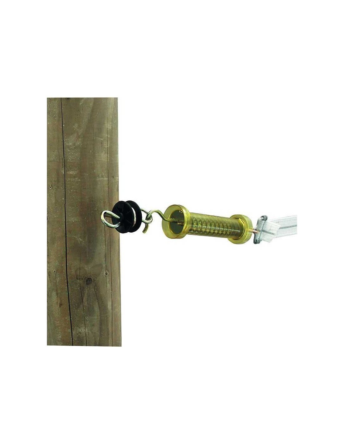 Este aislador, especialmente diseñado para puertas, asegura una fijación estable y segura del alambre, evitando el contacto accidental con los animales.