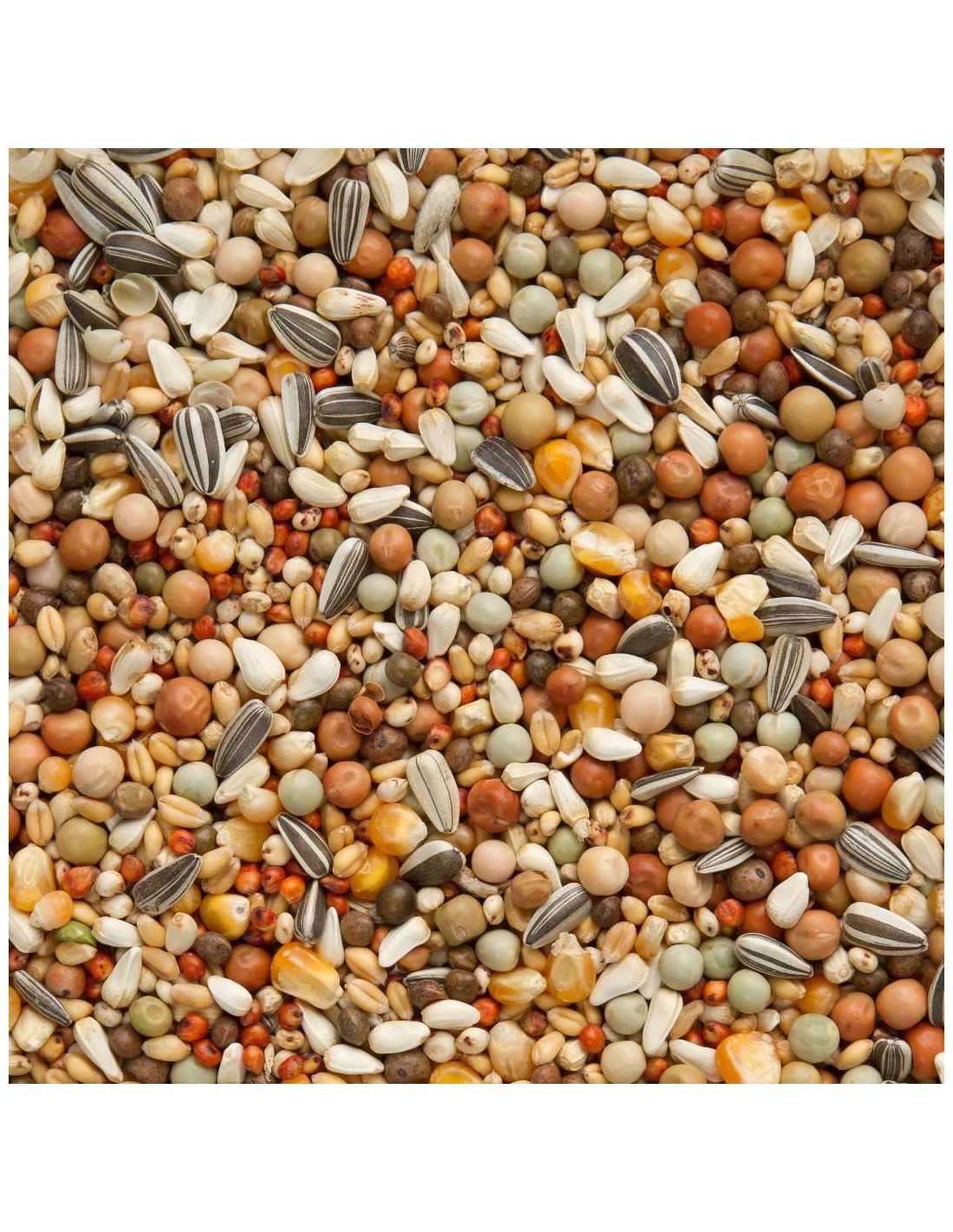 Esta mezcla incluye trigo blanco, guisantes dun, dari, sorgo rojo extra, guisantes pequeños verdes, guisantes pequeños amarillos, guisantes de invierno, semillas de girasol rayado, linaza y mostaza negra.