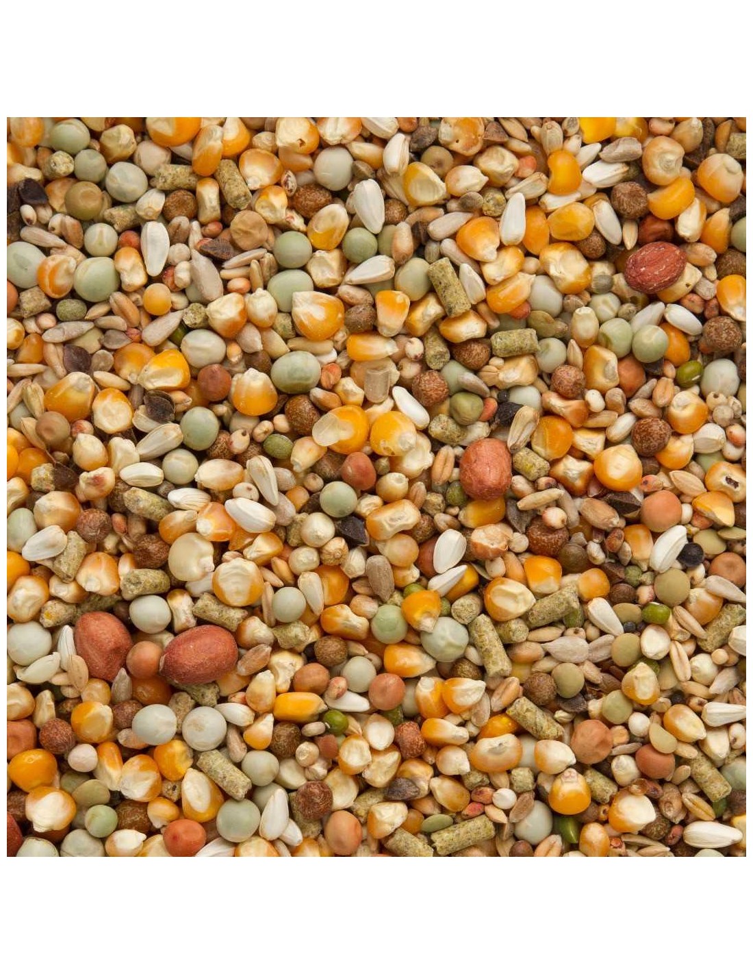 Con al menos 25 ingredientes de alta calidad, incluyendo pequeños cribbs maíz, cardy, guisantes verdes, maple peas, dari, dunpeas, popcorn maíz, sorgo rojo, trigo, Goldcorn, cacahuetes pelados, trigo sarraceno, cebada pelada, frijol idjoe, mostaza, linaza, lentejas, arroz paddy, semillas de mostaza, semillas de girasol, semillas de calabaza, semillas de mijo blanco, semillas de sésamo y semillas de canario, esta mezcla proporciona una nutrición completa y equilibrada.