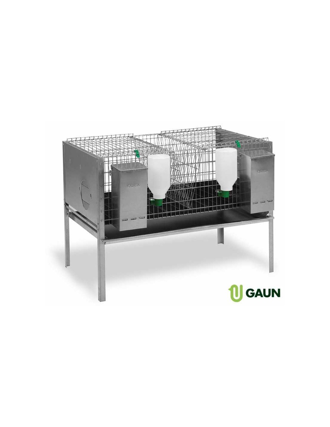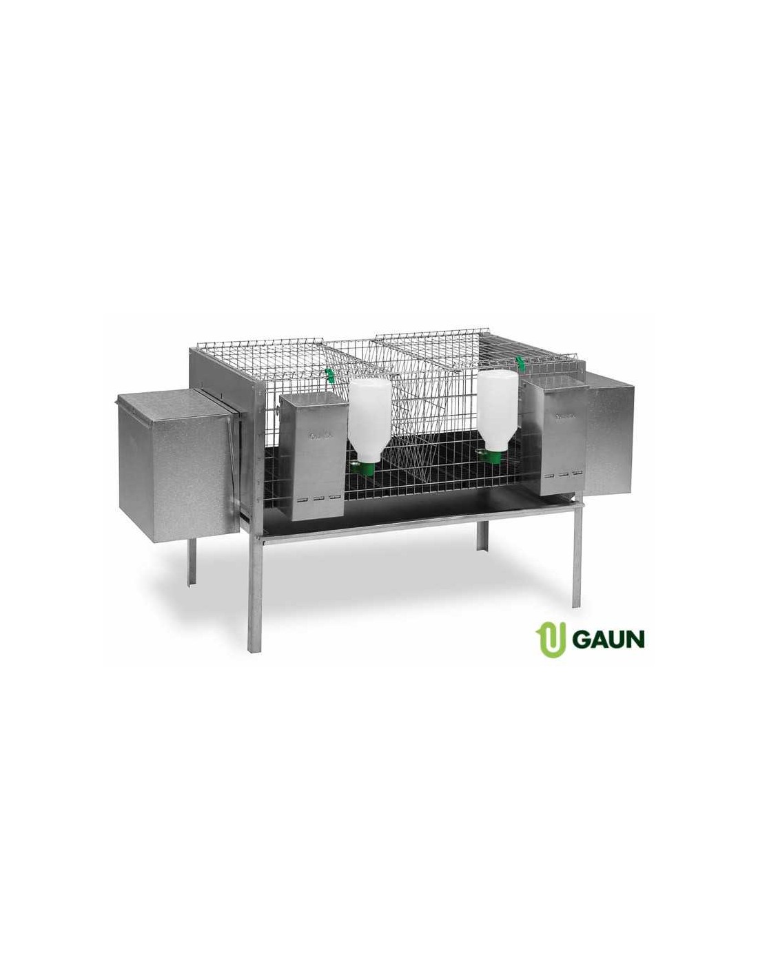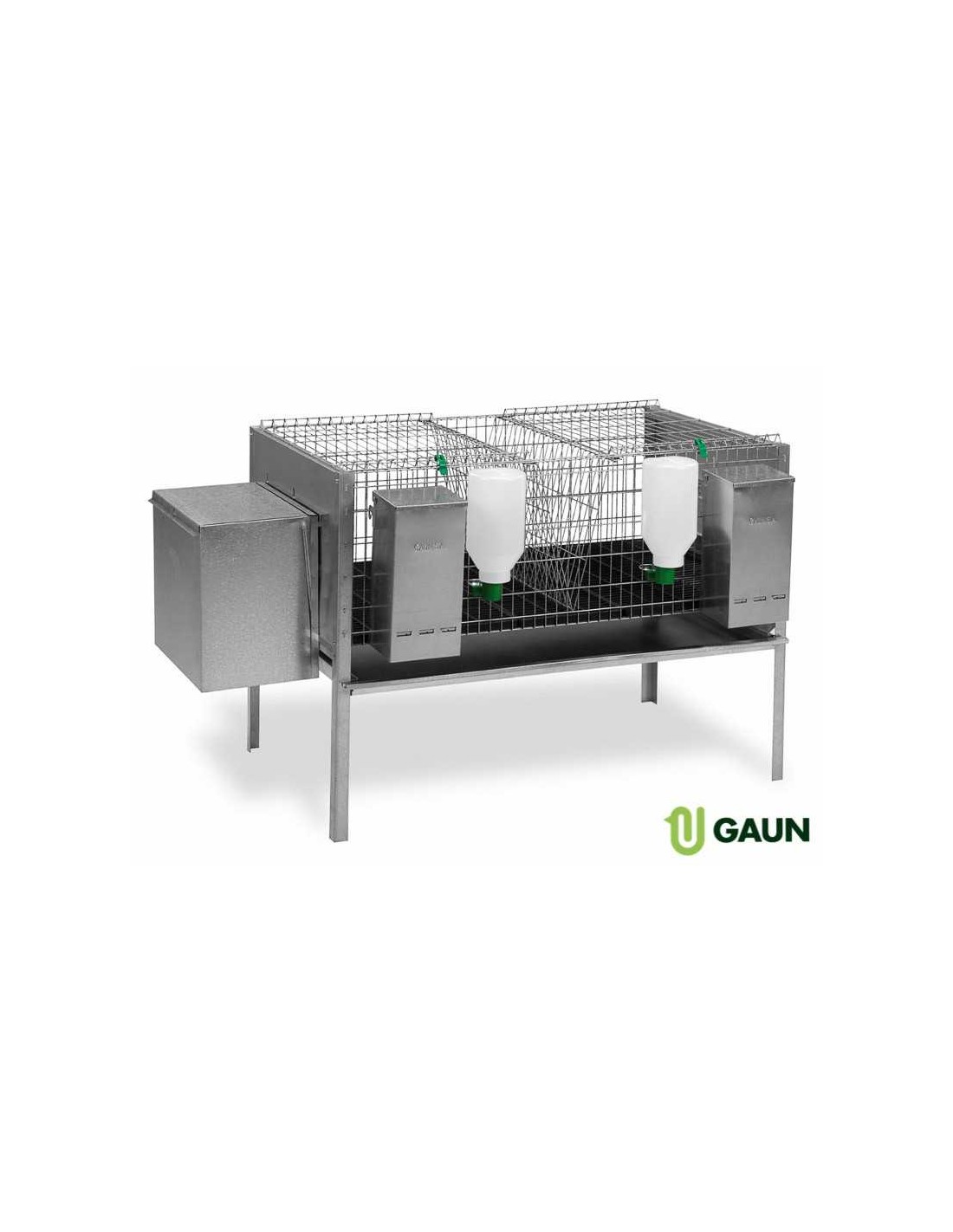 Incluye bebederos GAUN con botella, tolvas de dos huecos con tapa, forrajeras y bandeja colectora de excrementos.