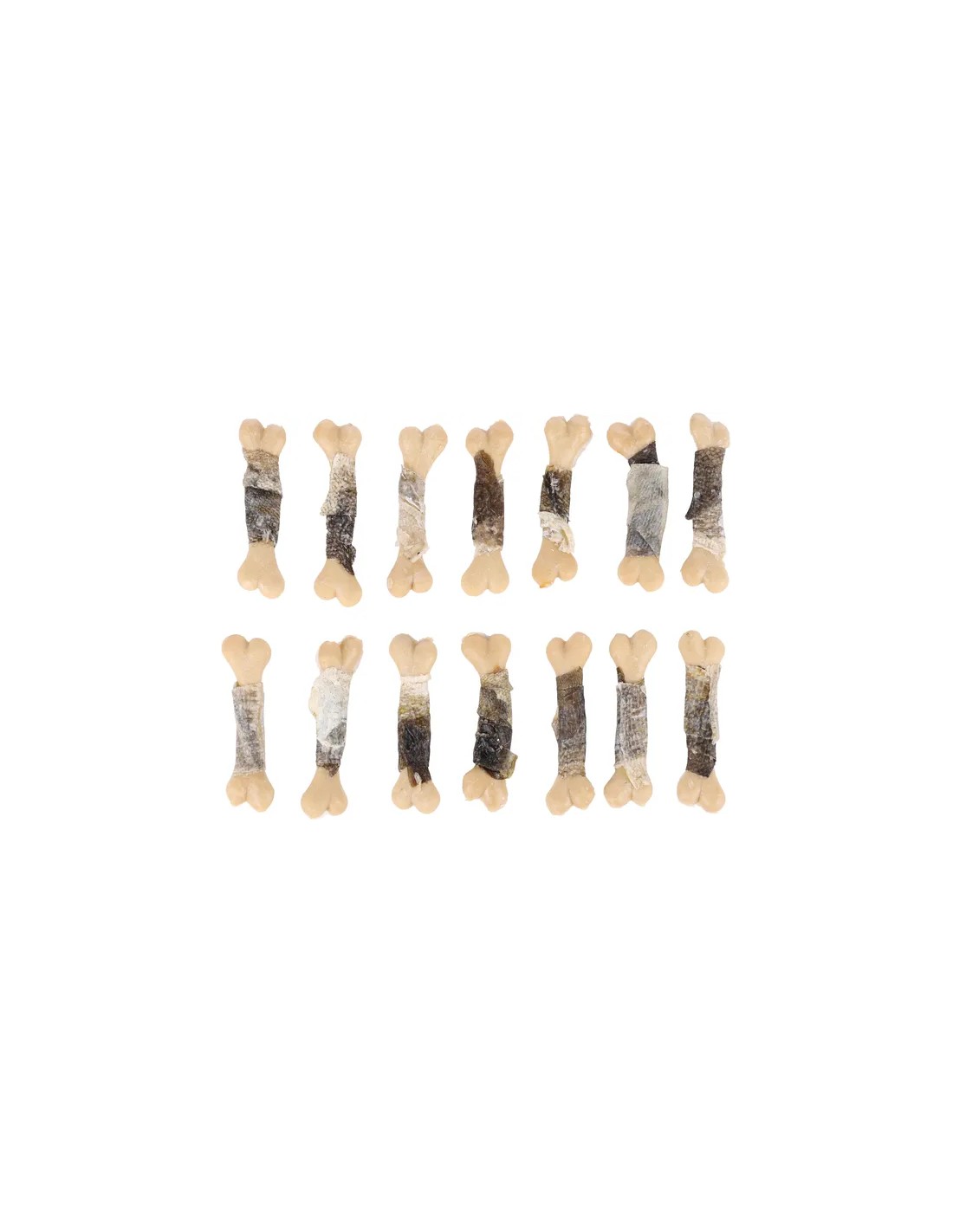Con un contenido de 85 gramos por paquete, estos huesos masticables están hechos con piel de pescado y enriquecidos con calcio, proporcionando una fuente de nutrientes esenciales para el desarrollo y mantenimiento de dientes y huesos fuertes.