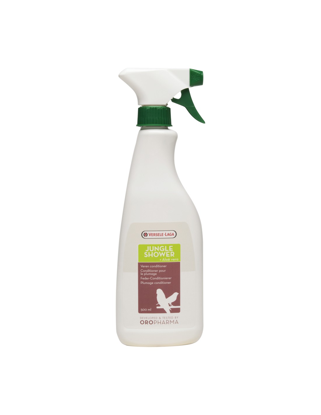 El OROPHARMA JUNGLE SHOWER - 500 ML de VERSELE LAGA es un acondicionador de plumas para aves de compañía que contiene aloe vera.