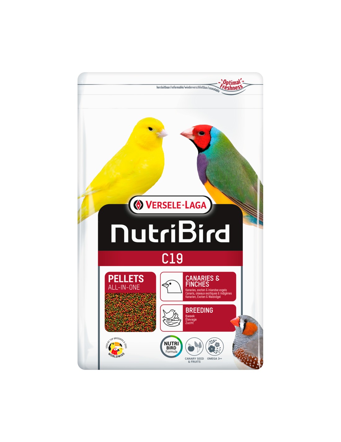 El NutriBird Canario C19 Cría de Versele-Laga es un alimento de pellets extruidos formulado para canarios y fringílidos exóticos y europeos durante la etapa de cría.