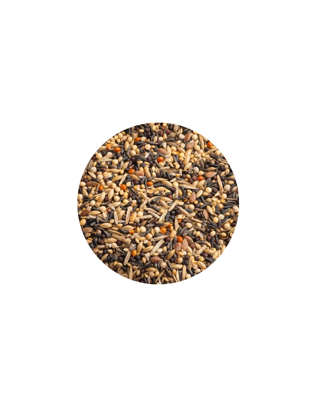 Compuesta por una selección de semillas de alta calidad, como alpiste, mijo blanco, avena pelada, negrillo, sarraceno, linaza y cañamón, esta mixtura asegura una alimentación variada y nutritiva.