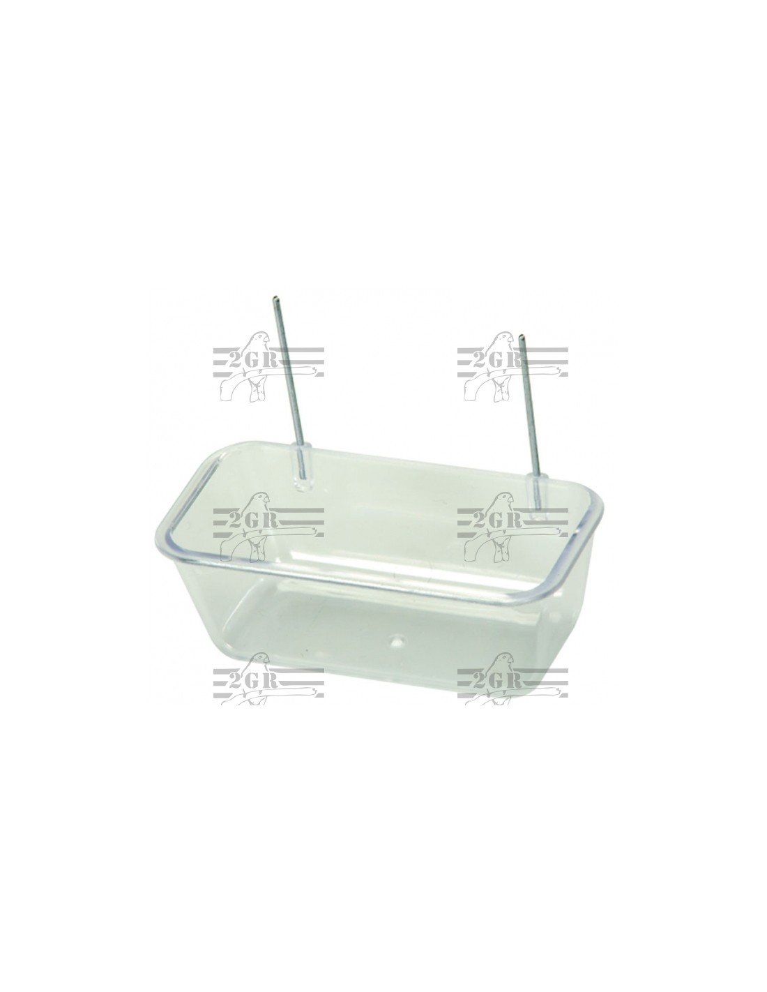 Fabricado con plástico resistente y translúcido, este comedero cuenta con ganchos en la parte posterior que facilitan su instalación.
