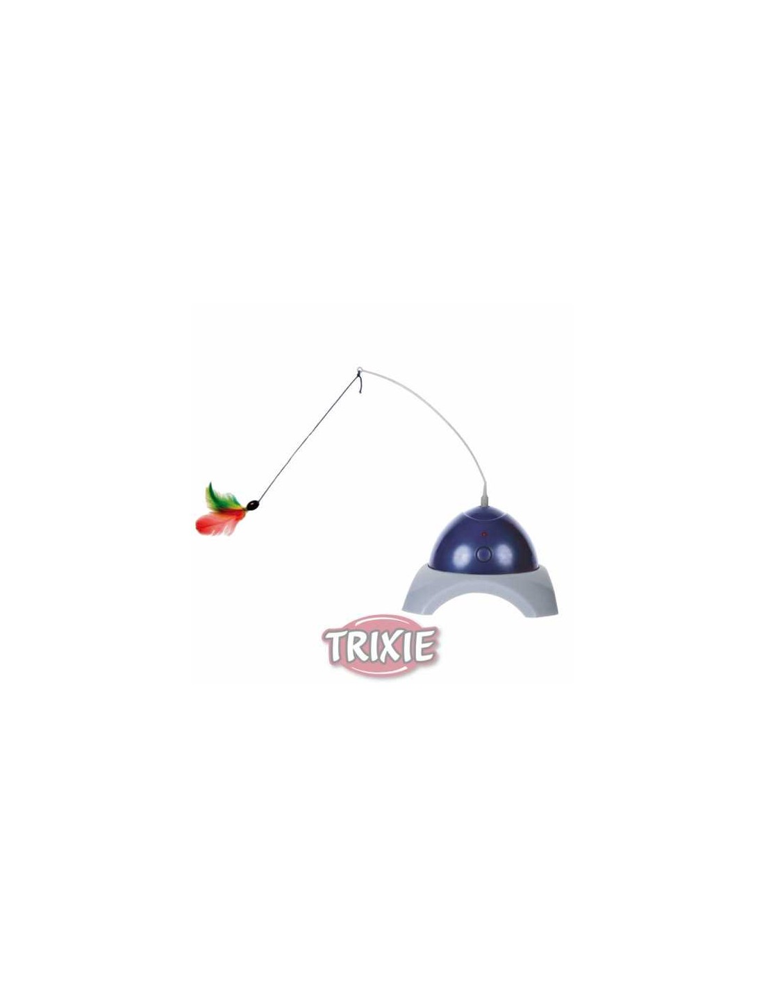 Este juguete incluye una base de plástico con un motor interno que hace girar una varita de plástico con un juguete de plumas, imitando el movimiento de una presa real.
