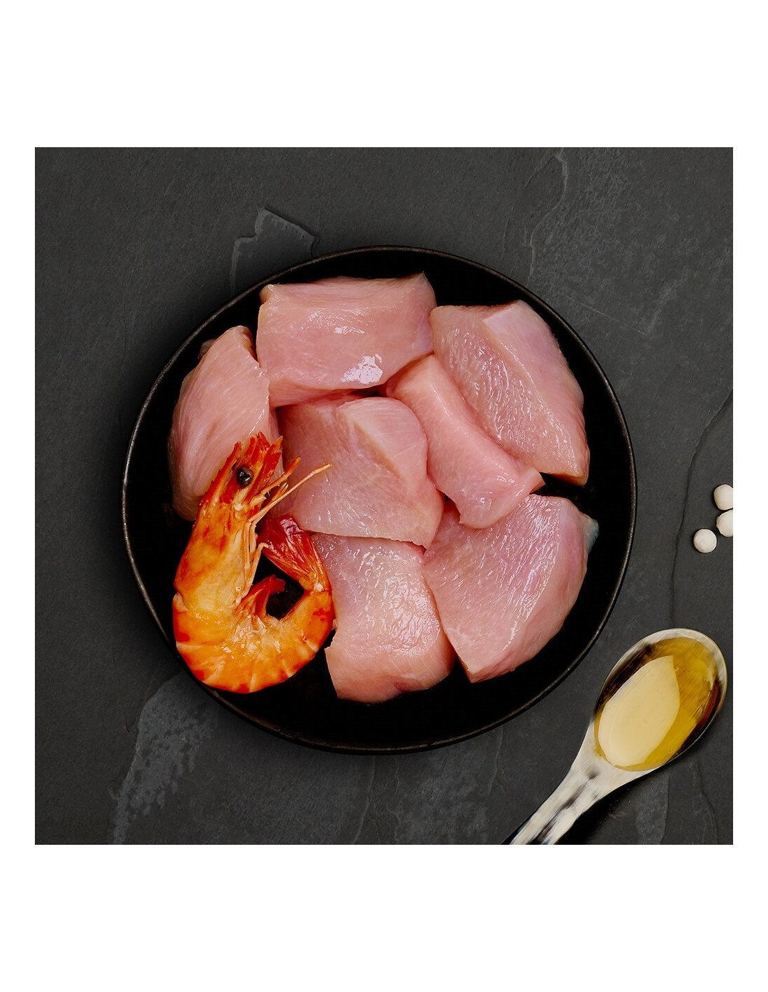 Esta lata de 75 gramos combina jugosos trozos de pollo con gambas frescas, cocidos lentamente para mantener intactos sus sabores y nutrientes naturales.