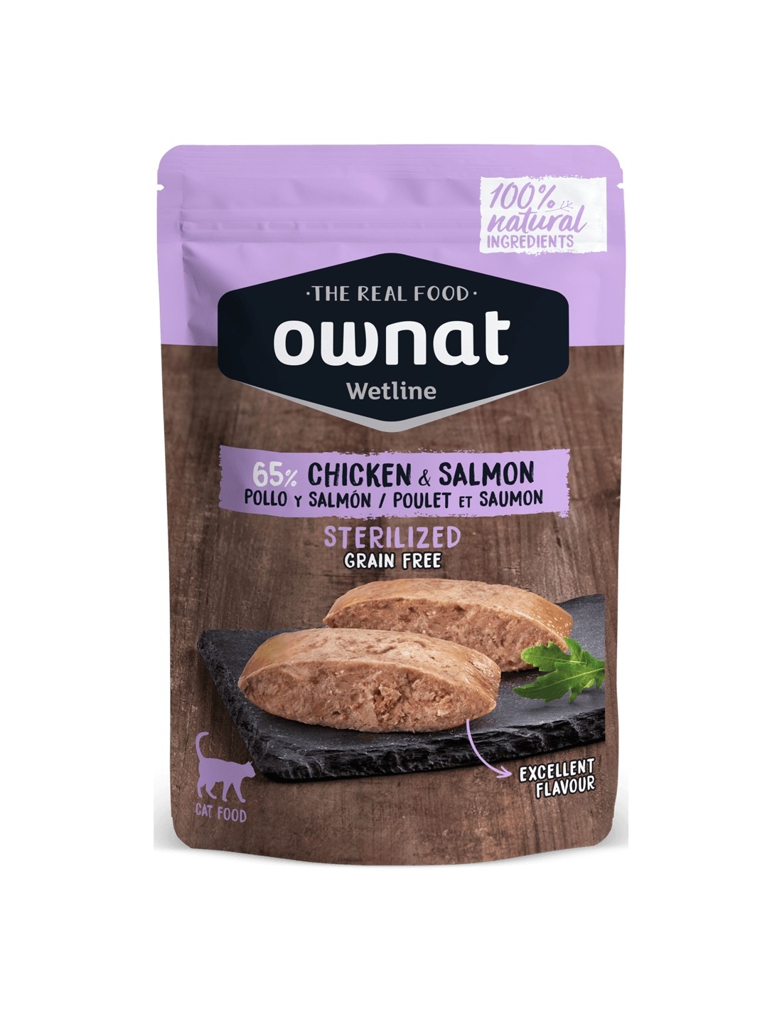 El OWNAT POUCHE POLLO Y SALMÓN PARA GATOS ESTERILIZADOS es la opción perfecta para proporcionar a tu gato esterilizado una dieta húmeda, deliciosa y nutritiva.
