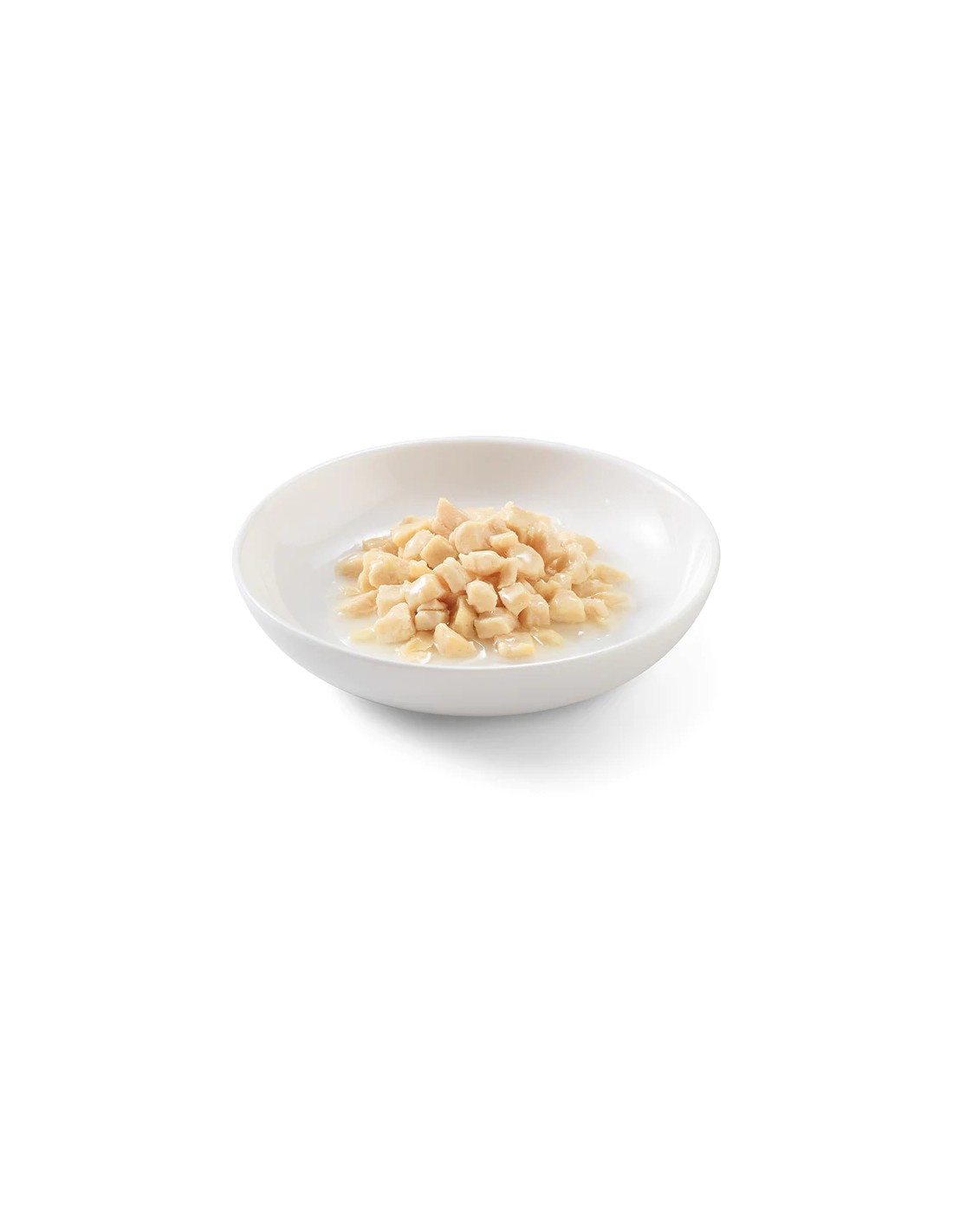Esta receta premium utiliza filetes de pollo de alta calidad, cocidos en su propio jugo y gelatina, garantizando la máxima conservación de los nutrientes esenciales y el sabor natural.