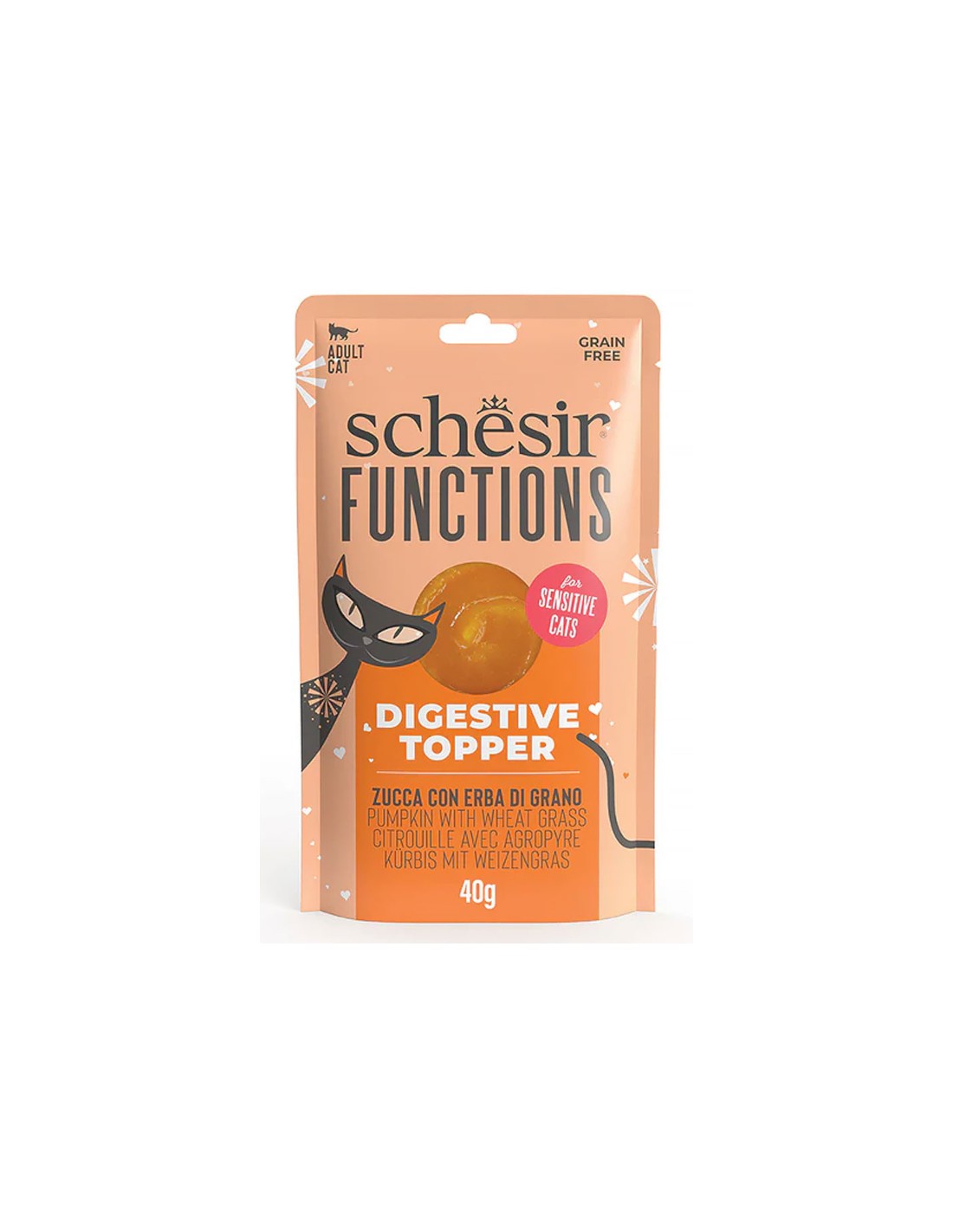 El SCHESIR Topper Función Digestiva Calabaza con Hierba de Trigo para Gatos (12 Unidades) - 12 x 40 GR ofrece una solución nutritiva y sabrosa para cuidar la salud digestiva de tu gato.
