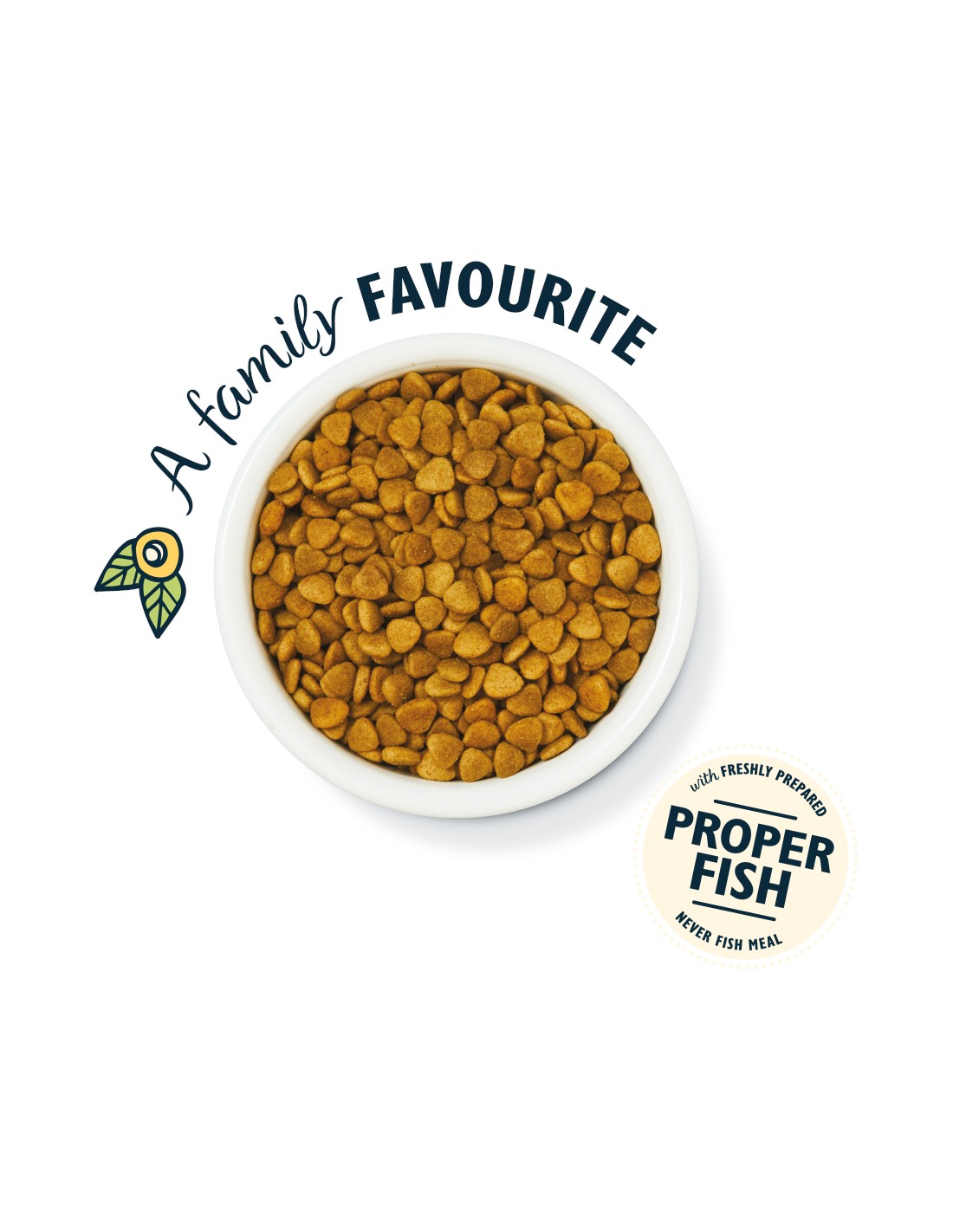 Elaborada con pescado blanco y salmón de alta calidad, esta receta rica en proteínas y ácidos grasos omega-3 ayuda a mantener un pelaje brillante y una piel saludable.