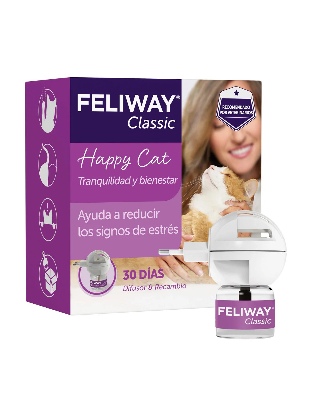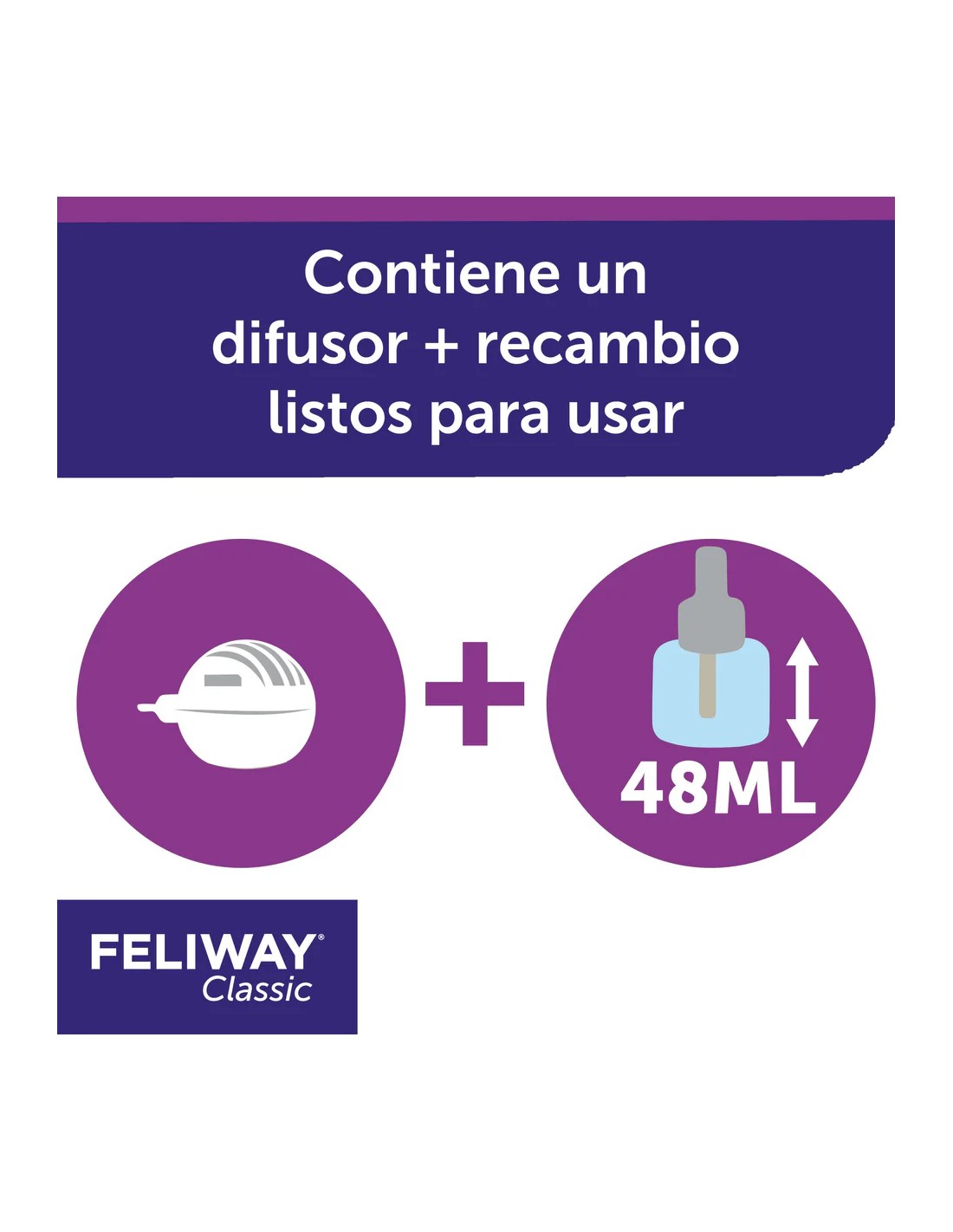 Perfecto para hogares con múltiples felinos o para momentos de cambio, este kit incluye un difusor eléctrico y un recambio con una duración de hasta un mes.