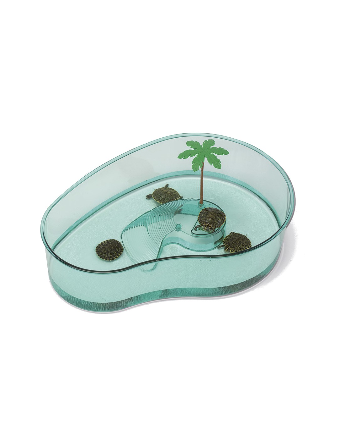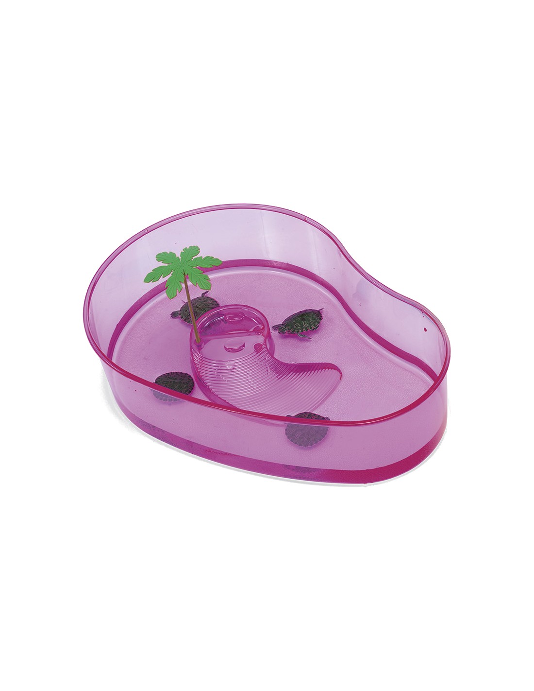 Su diseño incluye una plataforma elevada con una rampa, proporcionando un área ideal para que las tortugas se suban y se relajen.