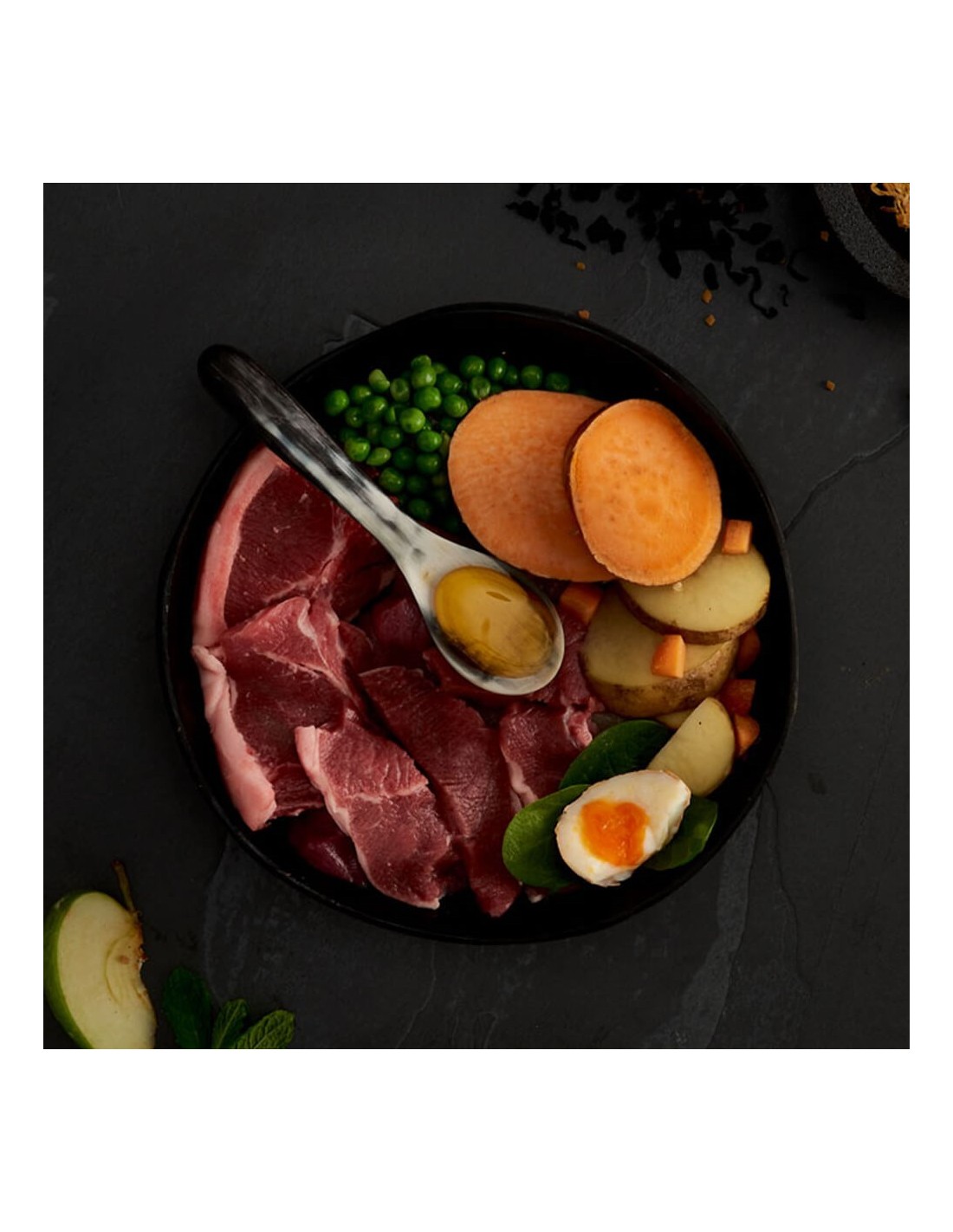 Este pienso sin cereales está elaborado con cordero de prado de alta calidad y una cuidadosa selección de frutas y verduras frescas, como manzana, zanahoria y espinacas.