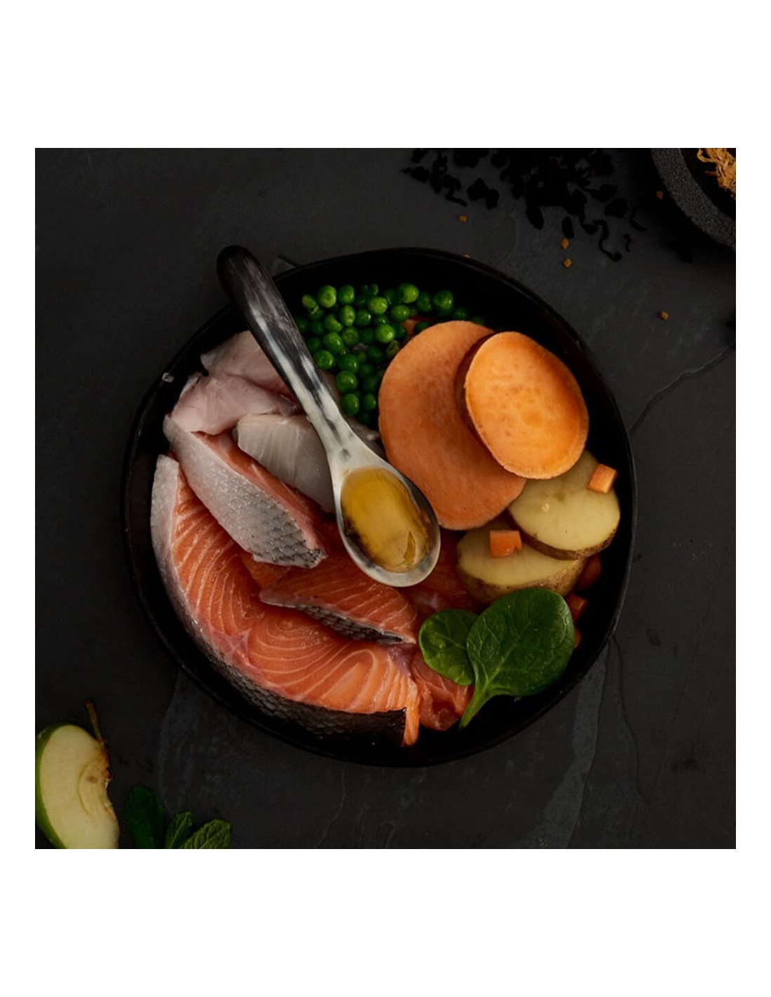 Este pienso sin cereales está elaborado con salmón escocés de alta calidad y una cuidadosa selección de frutas y verduras frescas, como batata, guisantes y algas.