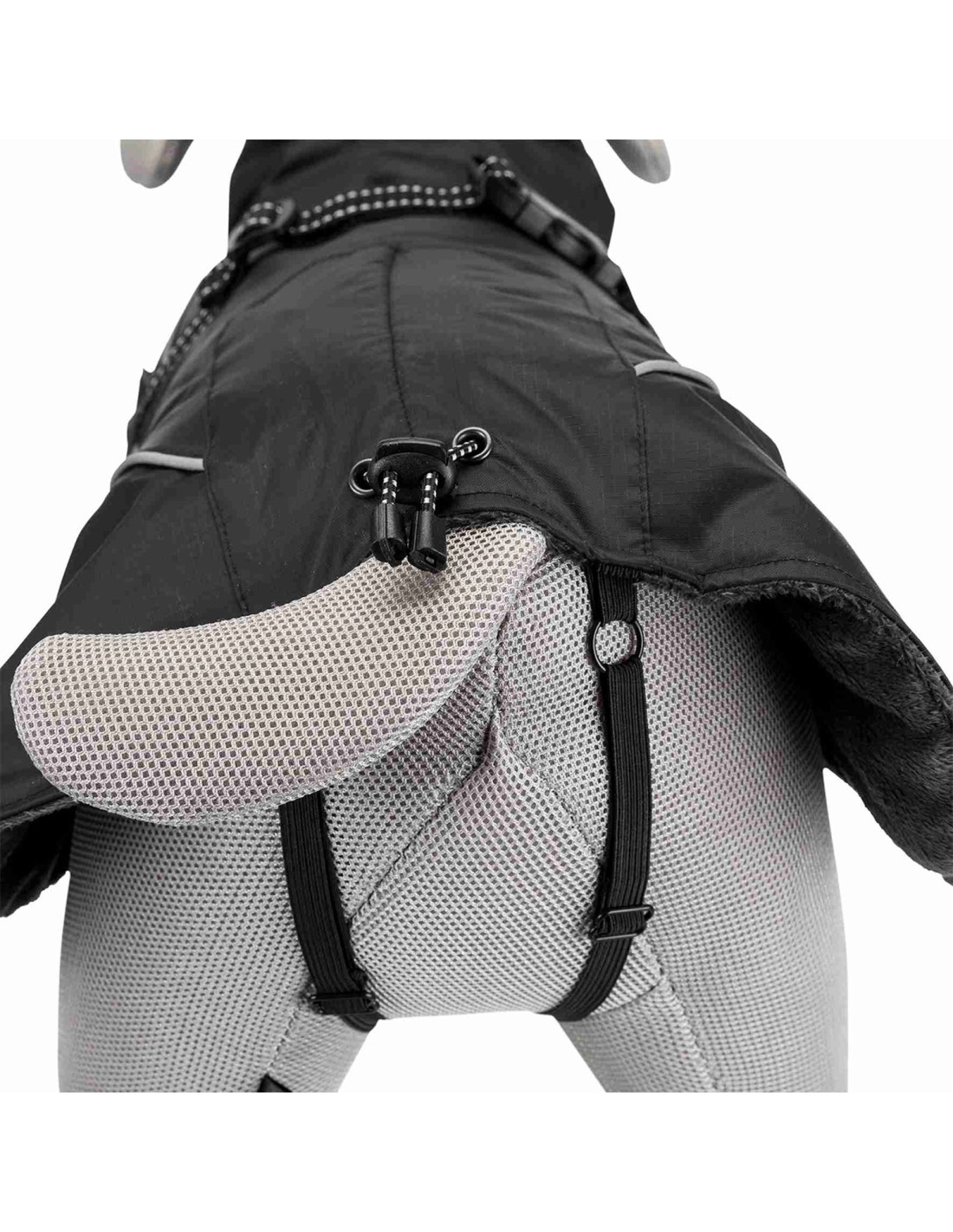 El diseño moderno del ABRIGO BRIZON NEGRO incluye bandas reflectantes para mejorar la visibilidad en condiciones de poca luz, garantizando la seguridad de tu perro.