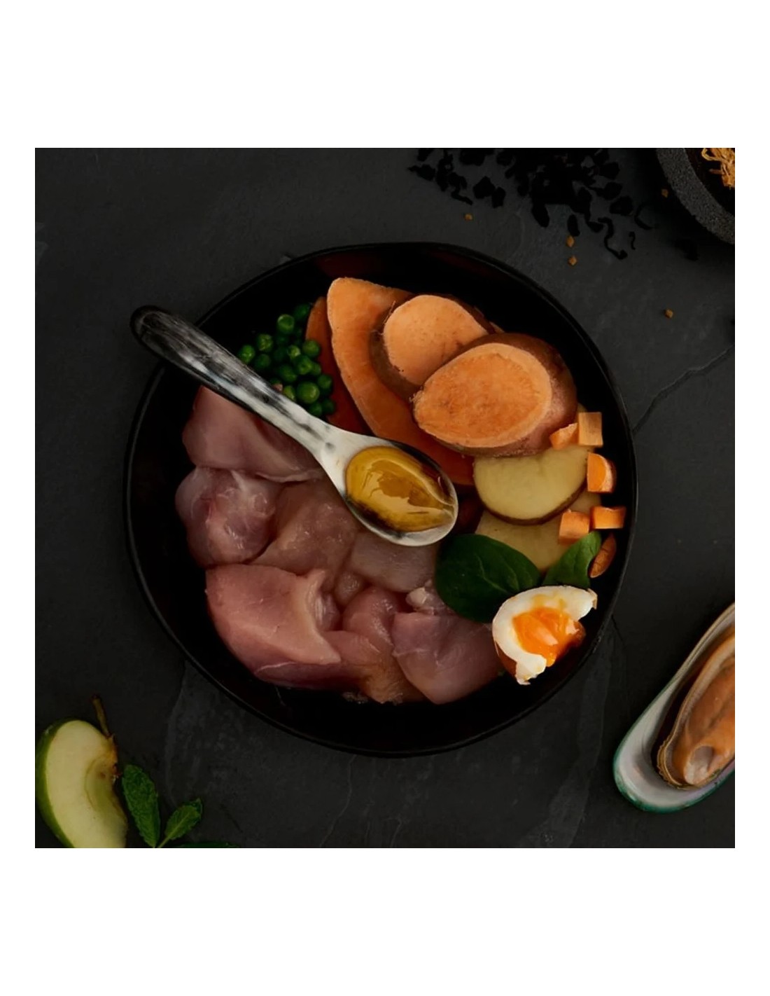 El pollo campero fresco y deshidratado es la fuente principal de proteínas, mientras que la batata y otras frutas y verduras seleccionadas aportan energía y fibra.