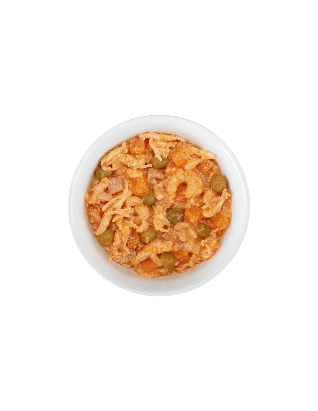 Esta comida húmeda presenta filetes de pollo acompañados de arroz integral, gambas, jamón y verduras, creando una combinación apetitosa y nutritiva.