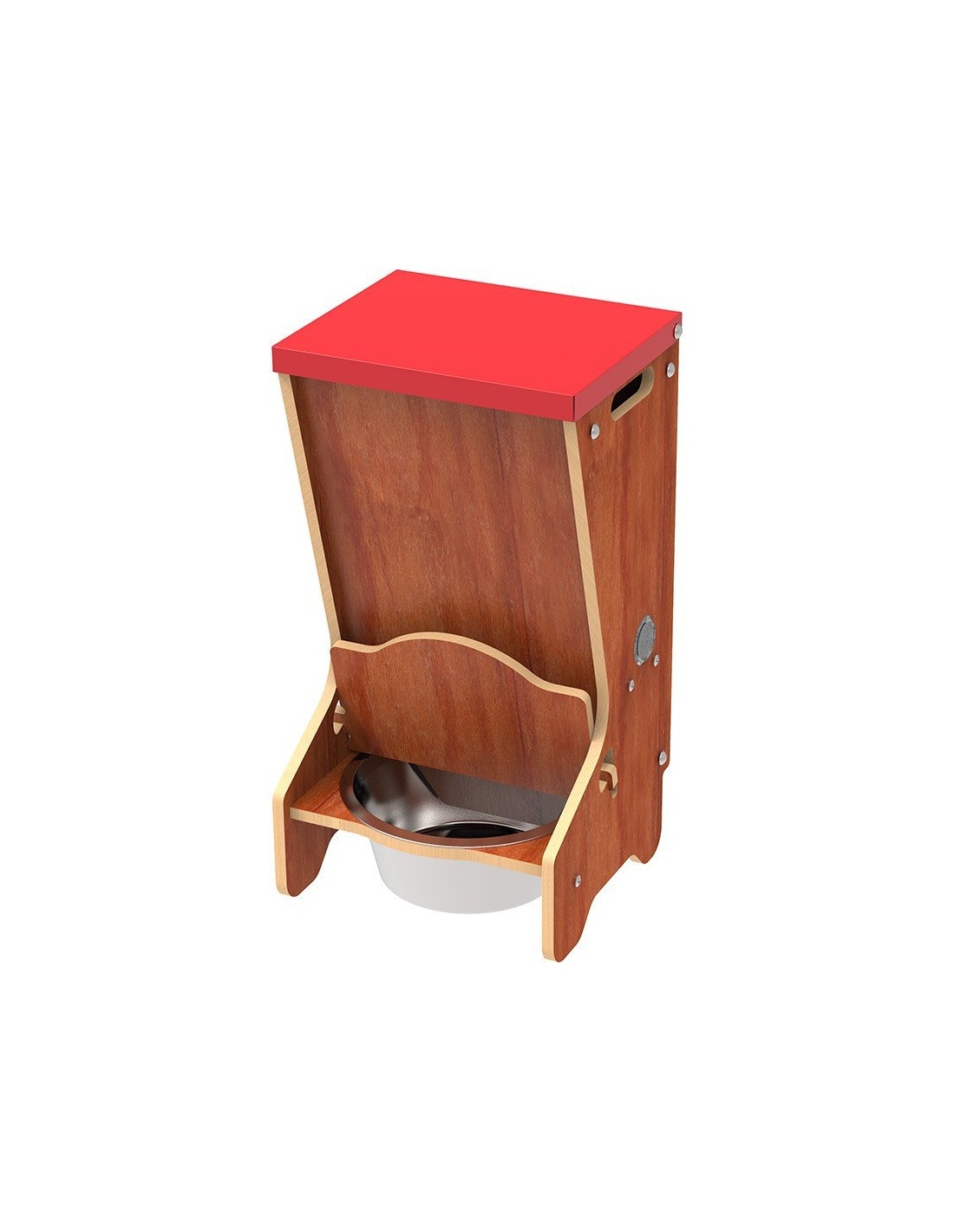 La madera de fenólica resistente a la humedad asegura que el comedero se mantenga en buen estado durante mucho tiempo, mientras que el plato de acero inoxidable facilita la limpieza y mantiene el alimento fresco.