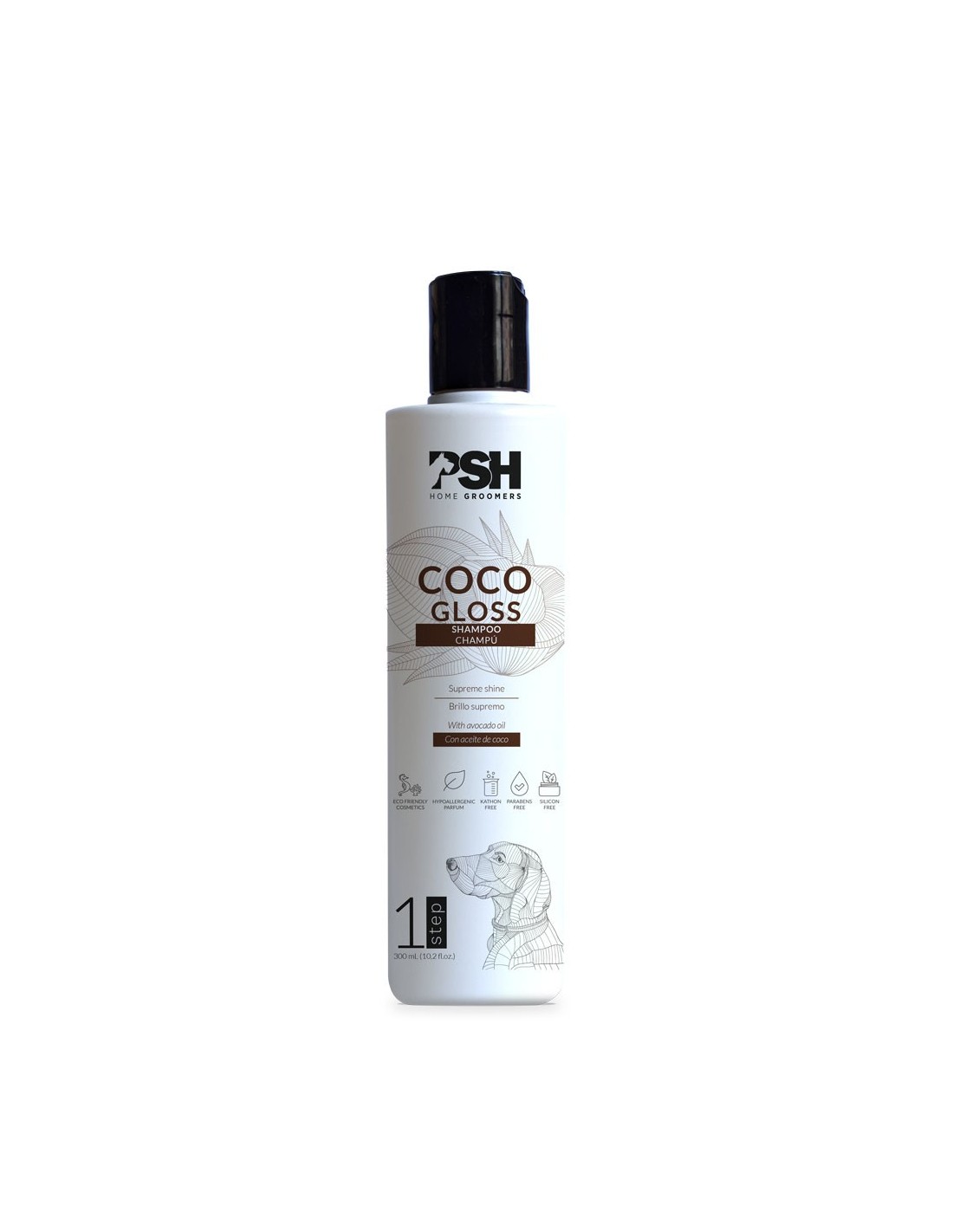 El Champú PSH Coco Gloss está especialmente diseñado para manto duro, proporcionando una hidratación intensa y un brillo natural.