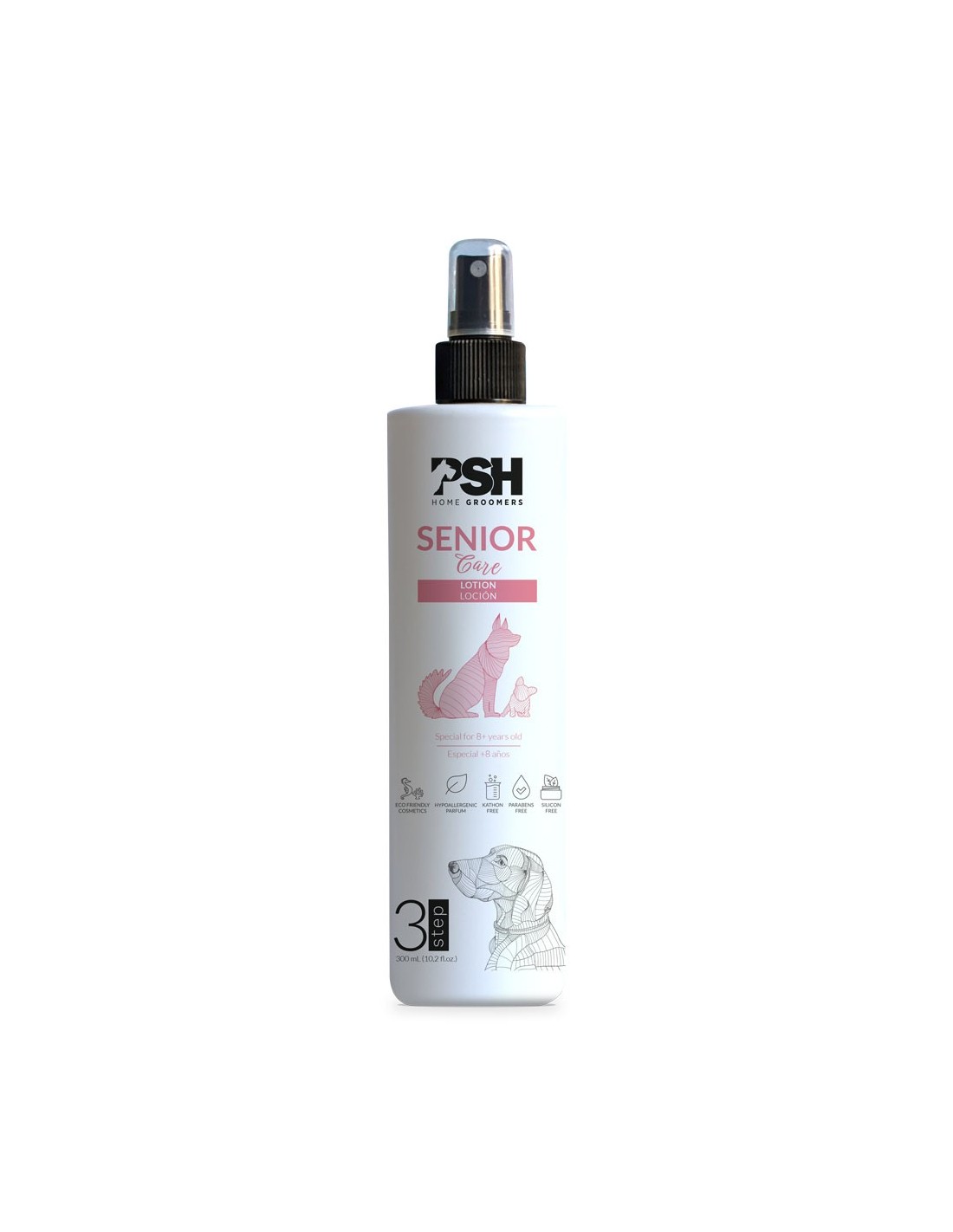 La Loción PSH Senior Care - 300 ml es una herramienta esencial para el cuidado del pelaje de tus mascotas senior.