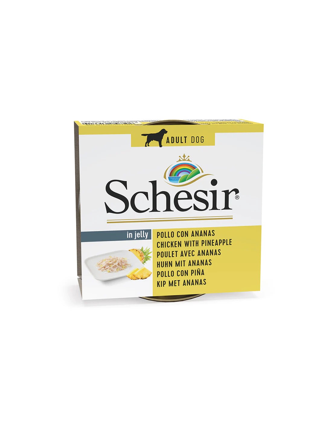 El Schesir Pollo y Piña en Gelatina para Perros (10 unidades) - 10 x 150 GR es la combinación perfecta de sabor y nutrición para tu mascota.