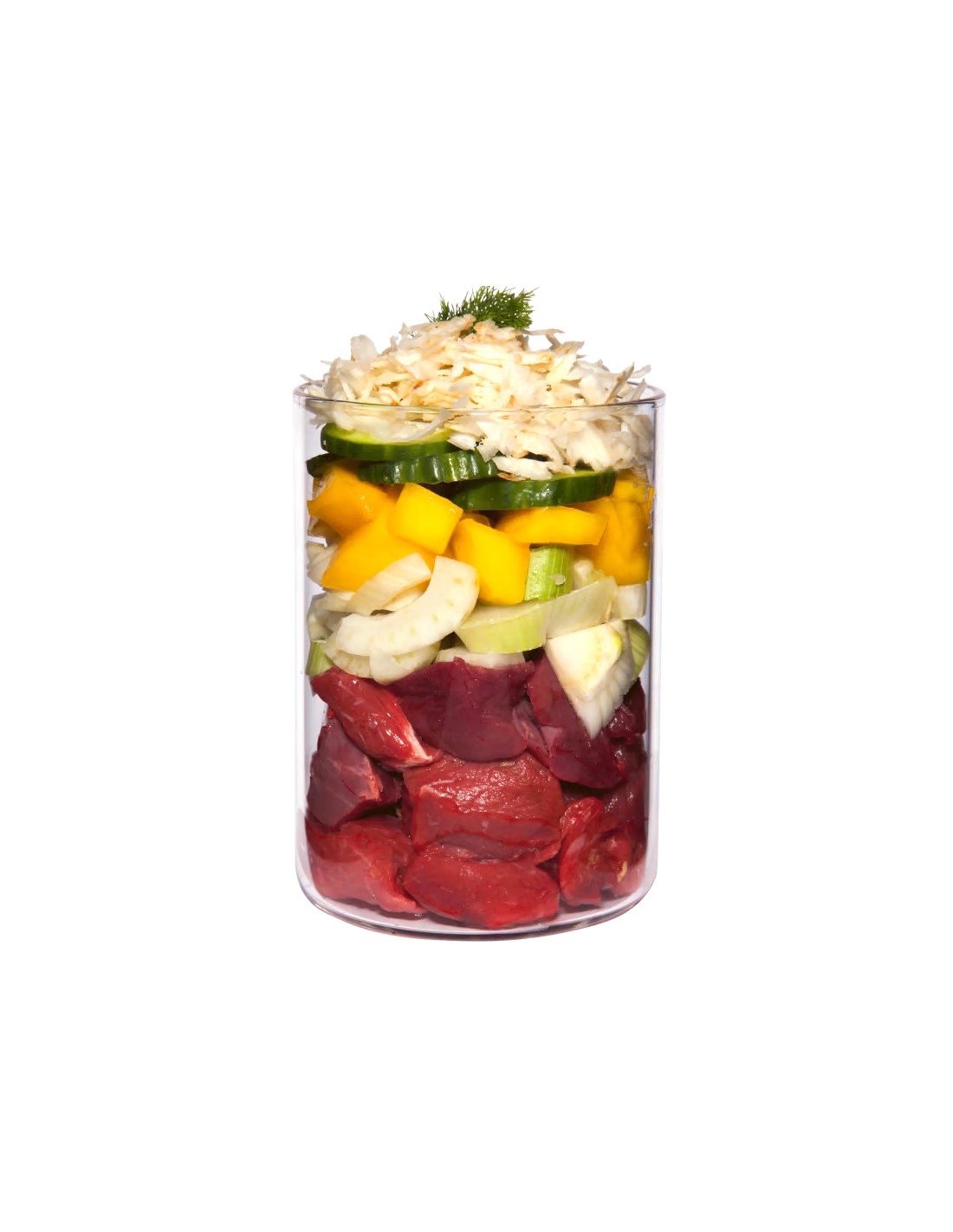 Con 400 gramos de contenido, esta fórmula gourmet incluye carne de buey magra, calabaza, mango y alcachofa, ofreciendo una nutrición equilibrada y rica en nutrientes.