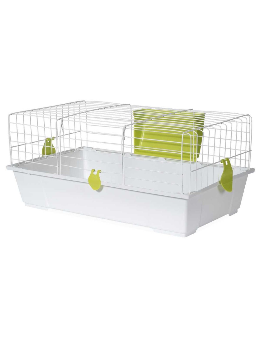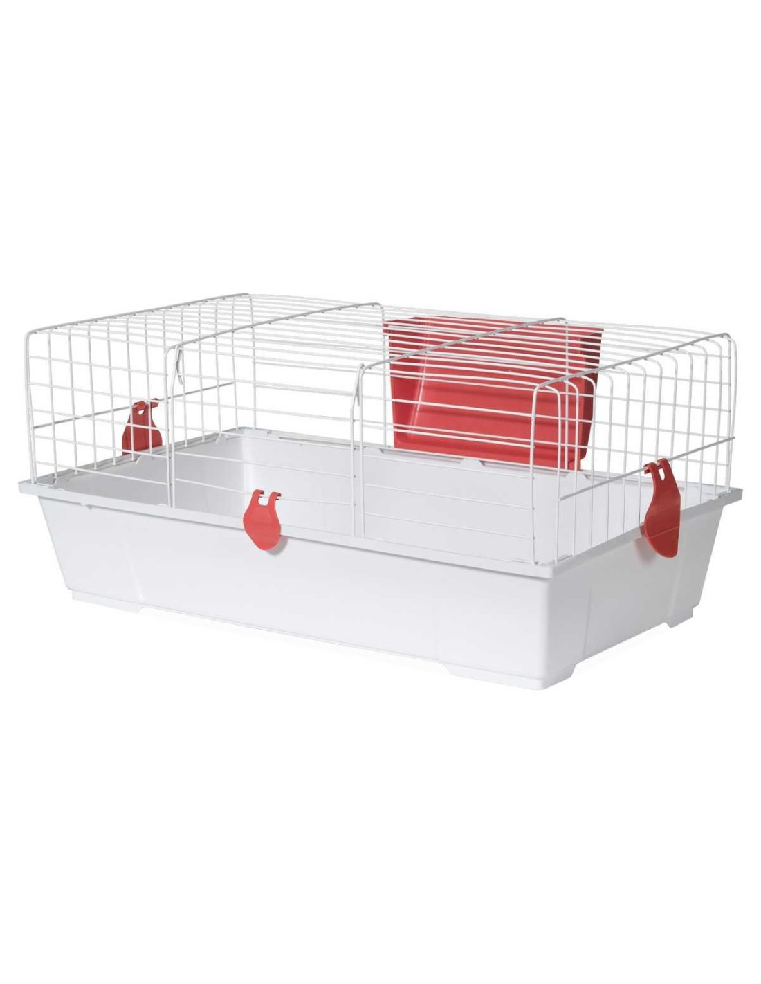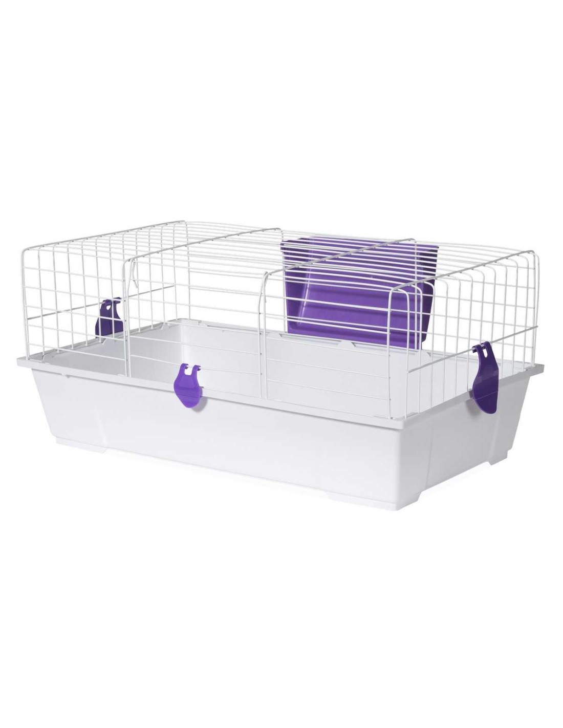 Equipado con varios accesorios esenciales como comederos y bebederos, esta jaula asegura que a tus conejos no les falte de nada.