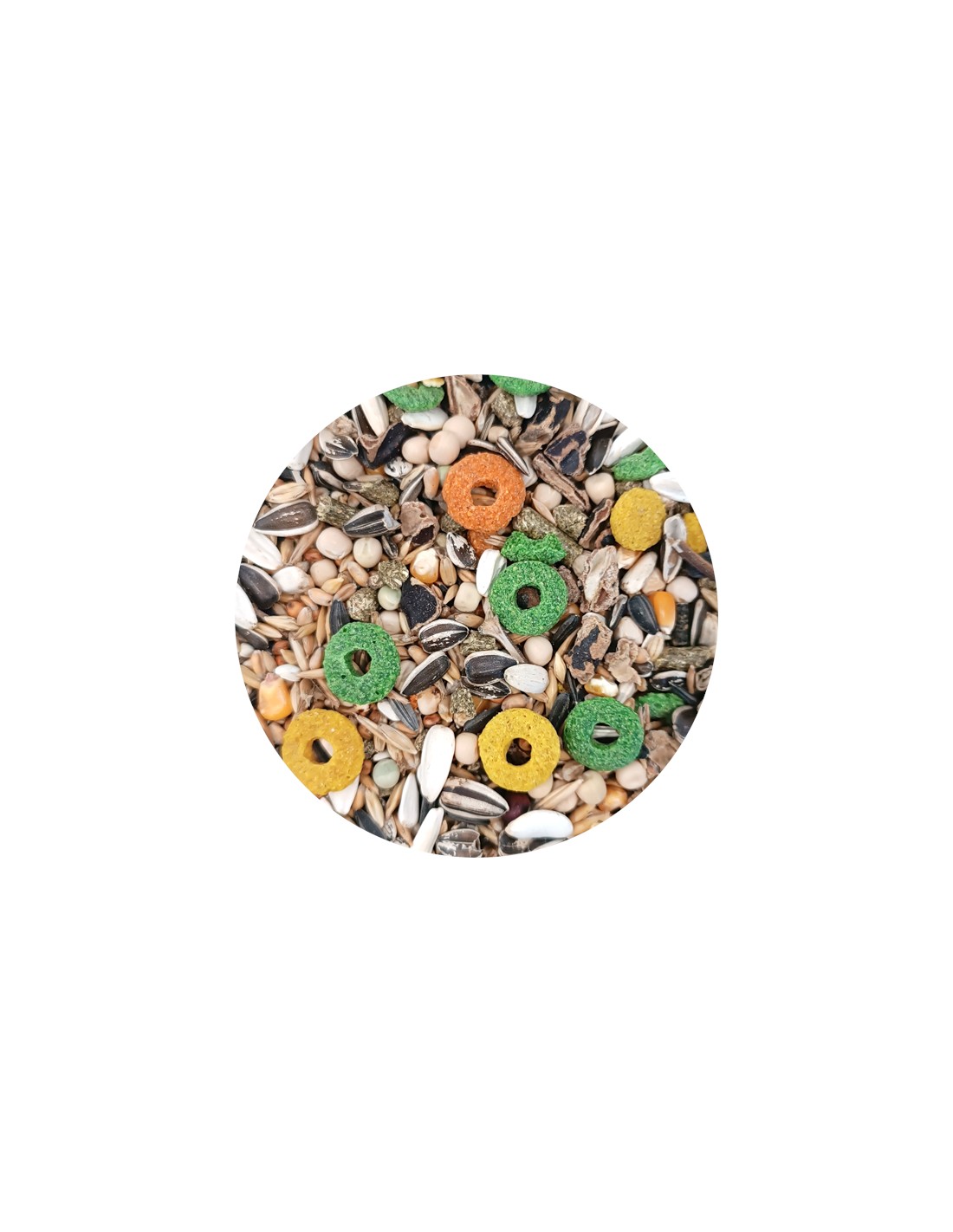 Esta mezcla de alta calidad contiene una variedad de ingredientes naturales, como semillas, cereales y frutas, que proporcionan una nutrición equilibrada y deliciosa para tu mascota.