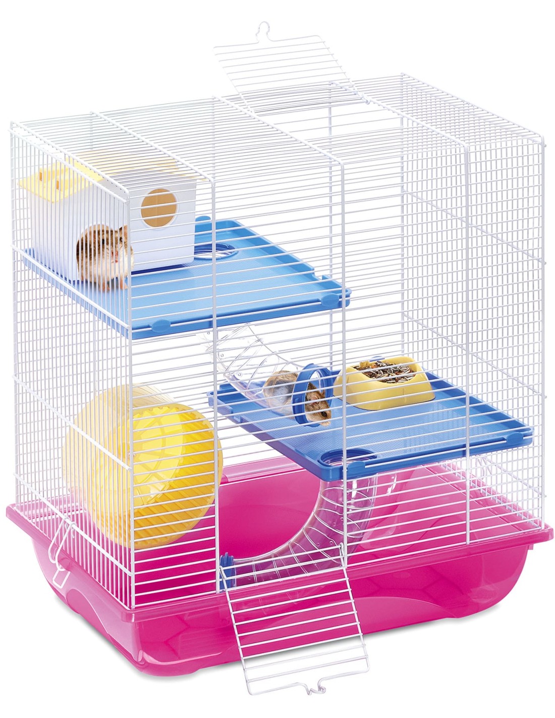 La jaula incluye una rueda de ejercicios, un comedero, un bebedero y una casita, cubriendo todas las necesidades esenciales de tu hámster.