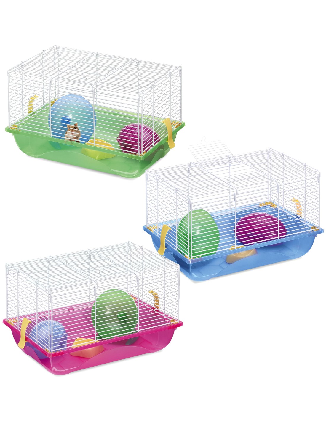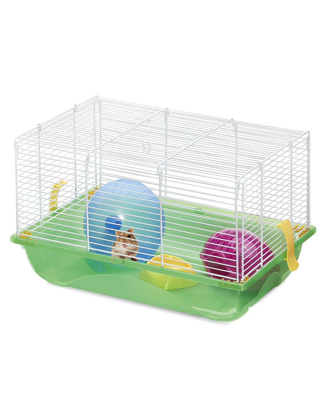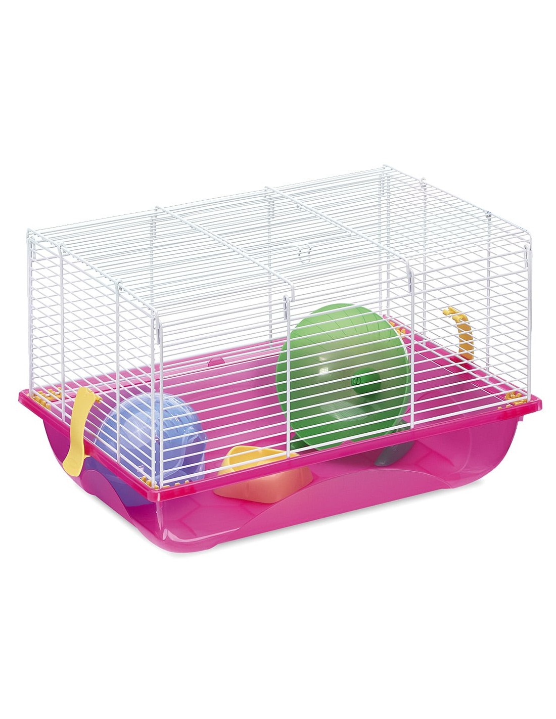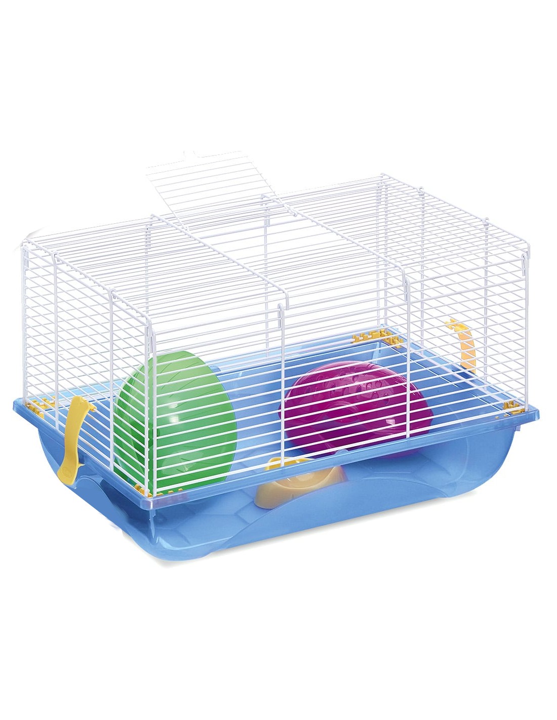 La jaula está equipada con una rueda de ejercicios, un comedero, un bebedero y una casita, cubriendo todas las necesidades básicas de tu mascota.